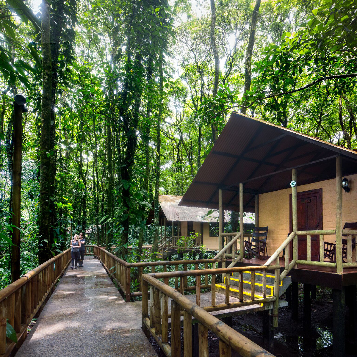 The resort is set on the Laguna Penitencia canal within the lush rainforest of Tortuguero National Park. All the rooms in this eco-lodge are mostly in single-storey wooden chalets built on stilts and comprising of a covered porch with rocking chairs, a fridge and a shower. The resort has a focus on sustainability and has some environmental policies such as no TV or air-conditioning – the windows have mosquito screens but no glass, and along with the overhead fan, this is enough to keep the rooms at a comfortable temperature. These ‘open’ windows mean that you can enjoy the early-morning jungle chorus! All meals served are buffet-style, with plenty of local vegetables and fish. There is a pool and a bar serving deliciously fruity cocktails, plus complimentary tea and coffee is available throughout the day. The lodge operates some activities which may be booked locally, including a recommended early morning boat tour.