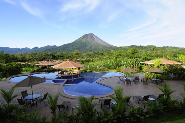This lovely four-star hotel has spectacular views of the Arenal volcano and is surrounded by beautiful, green gardens, forest and fields and is part of the original Manoa dairy farm. Enjoy authentic Costa Rican cuisine in the welcoming La Saca Restaurant or treat yourself to a pizza or tasty snack on the terrace of the Alambique Bistro, with volcano views. The outdoor pool features a fantastic swim-up bar, Uyuyui, serving cocktails prepared with fresh tropical fruit and boasts panoramic views of the volcano. It’s easy to relax and unwind at this hotel. Take a dip in the jacuzzies and hot springs, have a massage treatment in the spa, or simply sit in the rocking chairs on the terrace of your room and soak up the atmosphere. All of the spacious, air-conditioned rooms are in single-storey cottages spread out in the extensive grounds and shuttles are available to and from the rooms furthest away. All rooms have a shower, hairdryer, fridge, safe, TV, tea and coffee making facilities, complimentary Wi-Fi and a private terrace with rocking chairs. This hotel will be used for all tours between May and November.